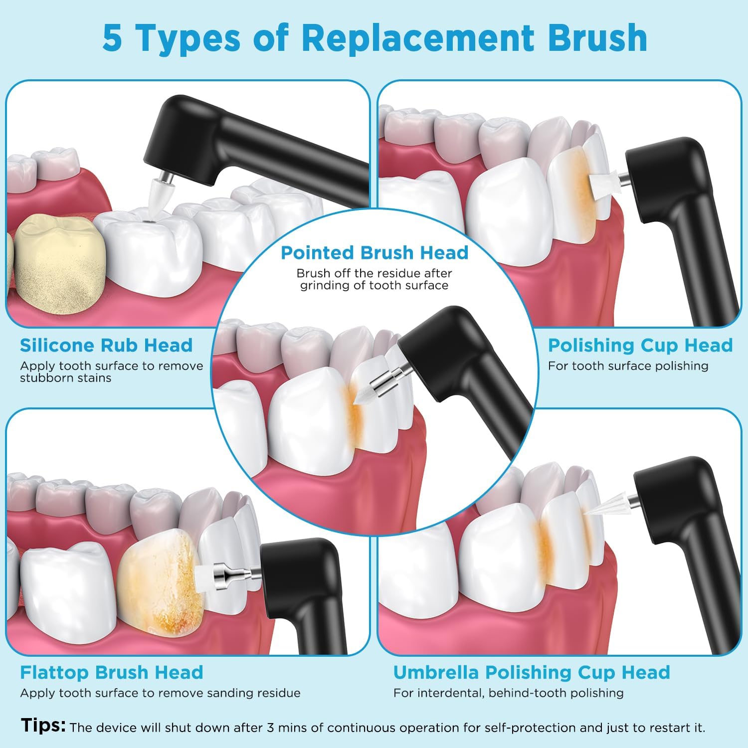 - Teeth Cleaning and Polishing Kit – This teeth cleaning kit includes 5 cleaning brush heads and 3 polishing pastes, offering a variety of functions and effects with 5 types of brush heads: polishing brush head, pointed brush head, flat brush head, cup-shaped polishing brush head, and umbrella-shaped polishing brush head. You can select different brush heads based on your dental needs, and when combined with the polishing paste, it helps prevent cavities.
